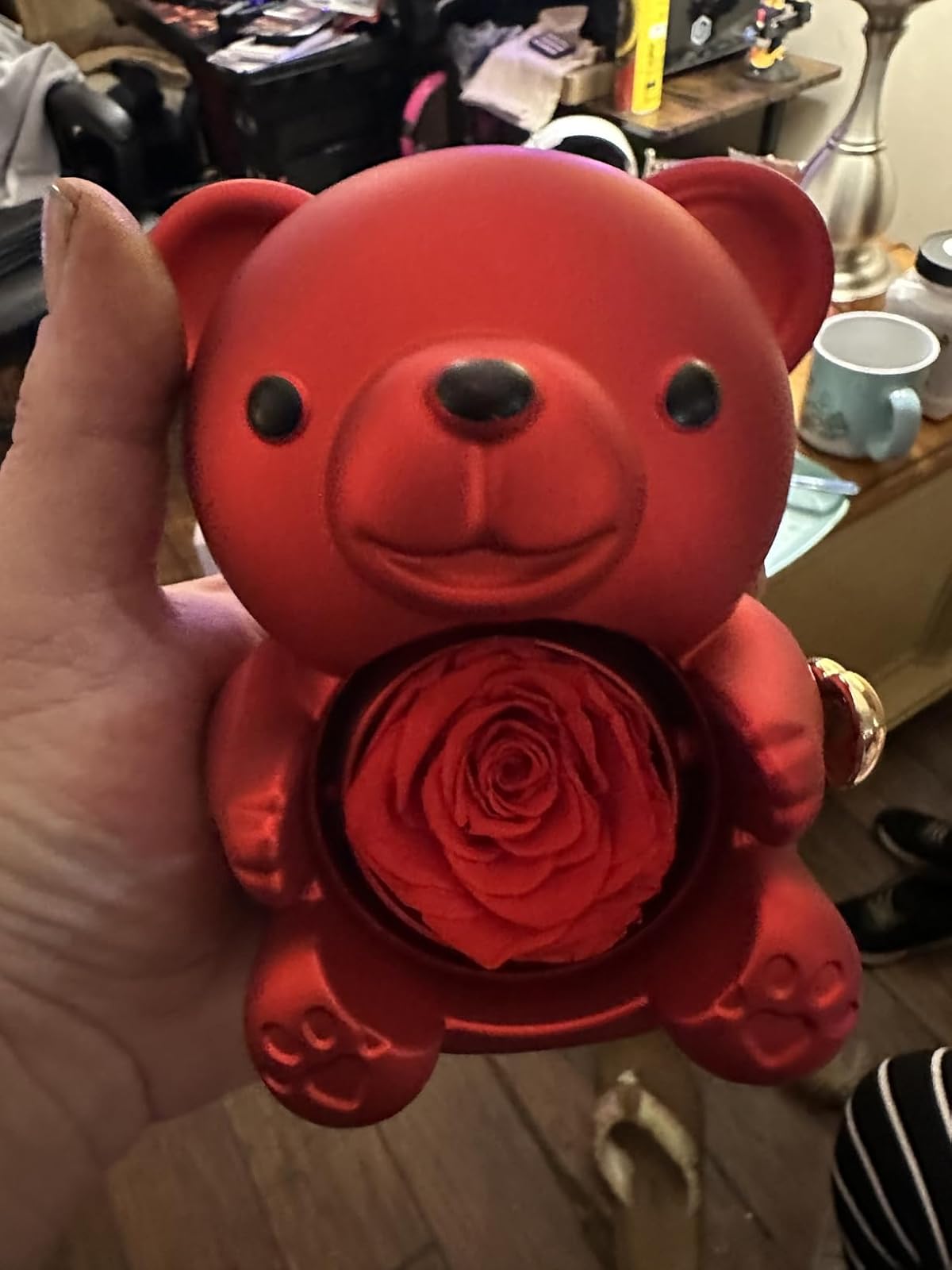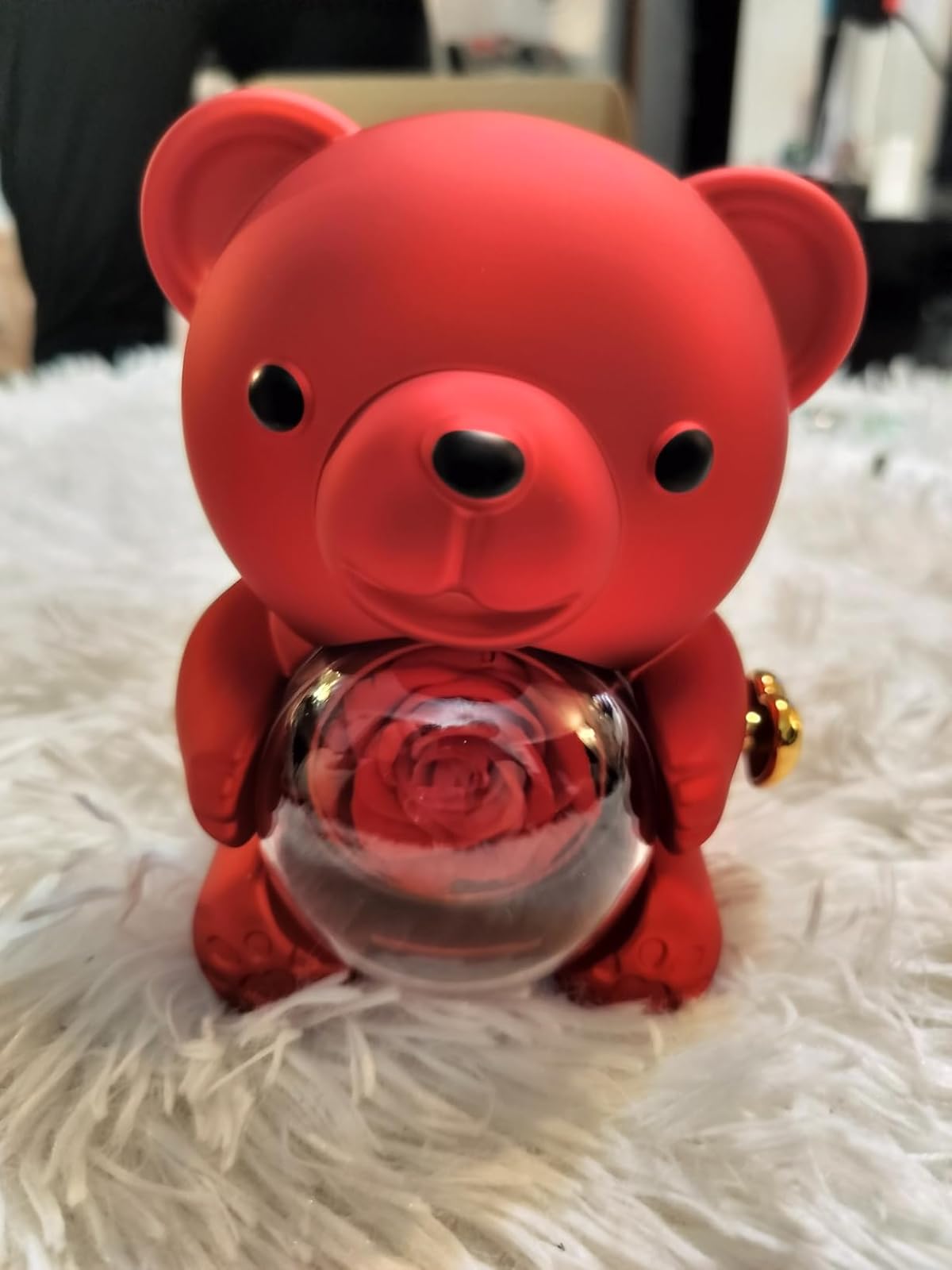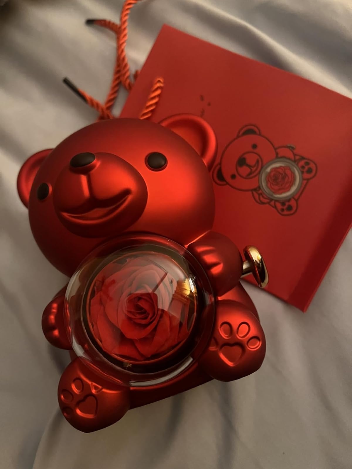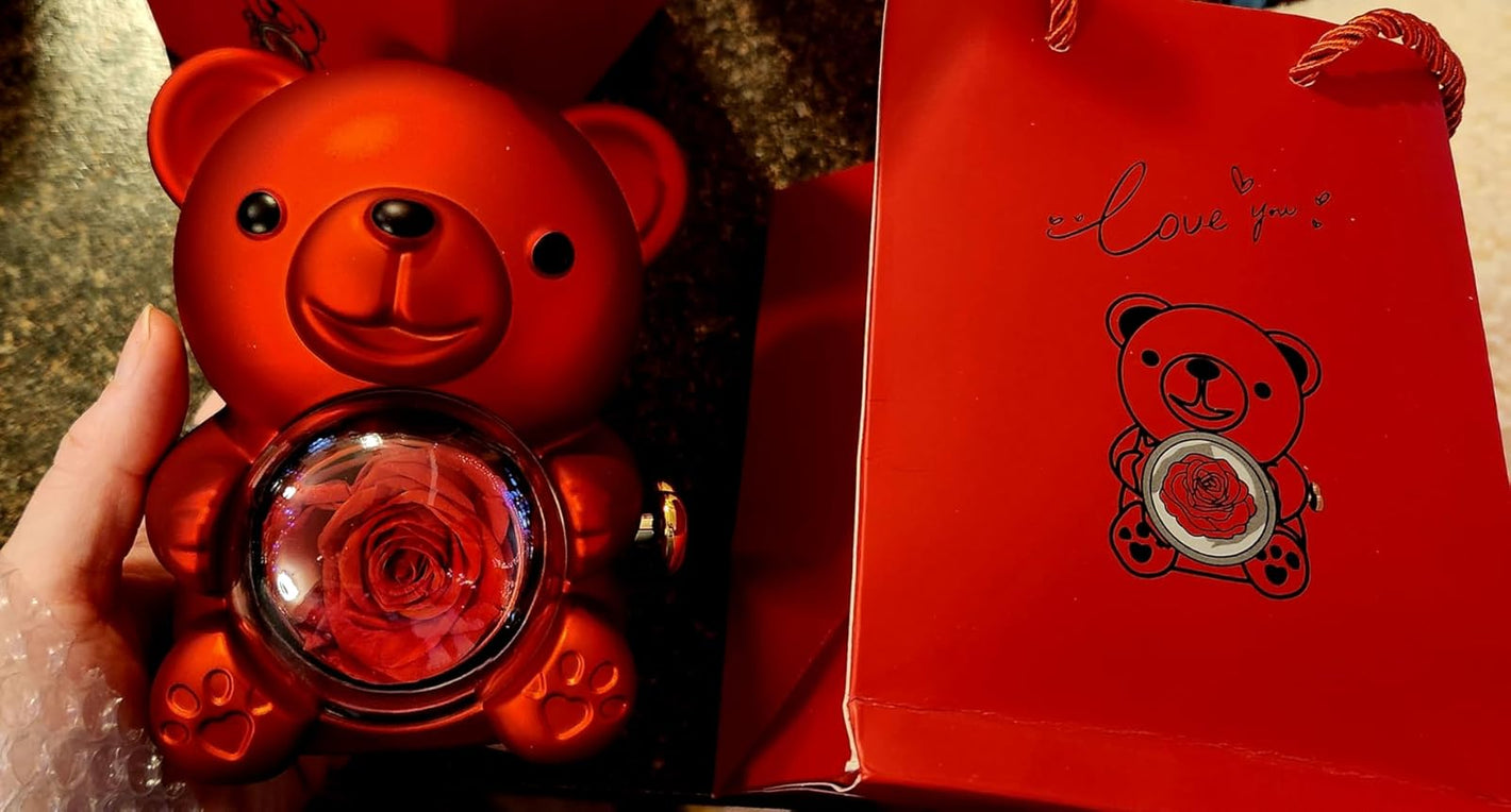 You’ll receive a red teddy bear with a preserved rose, a greeting card, and a luxury gift box — ready to gift.