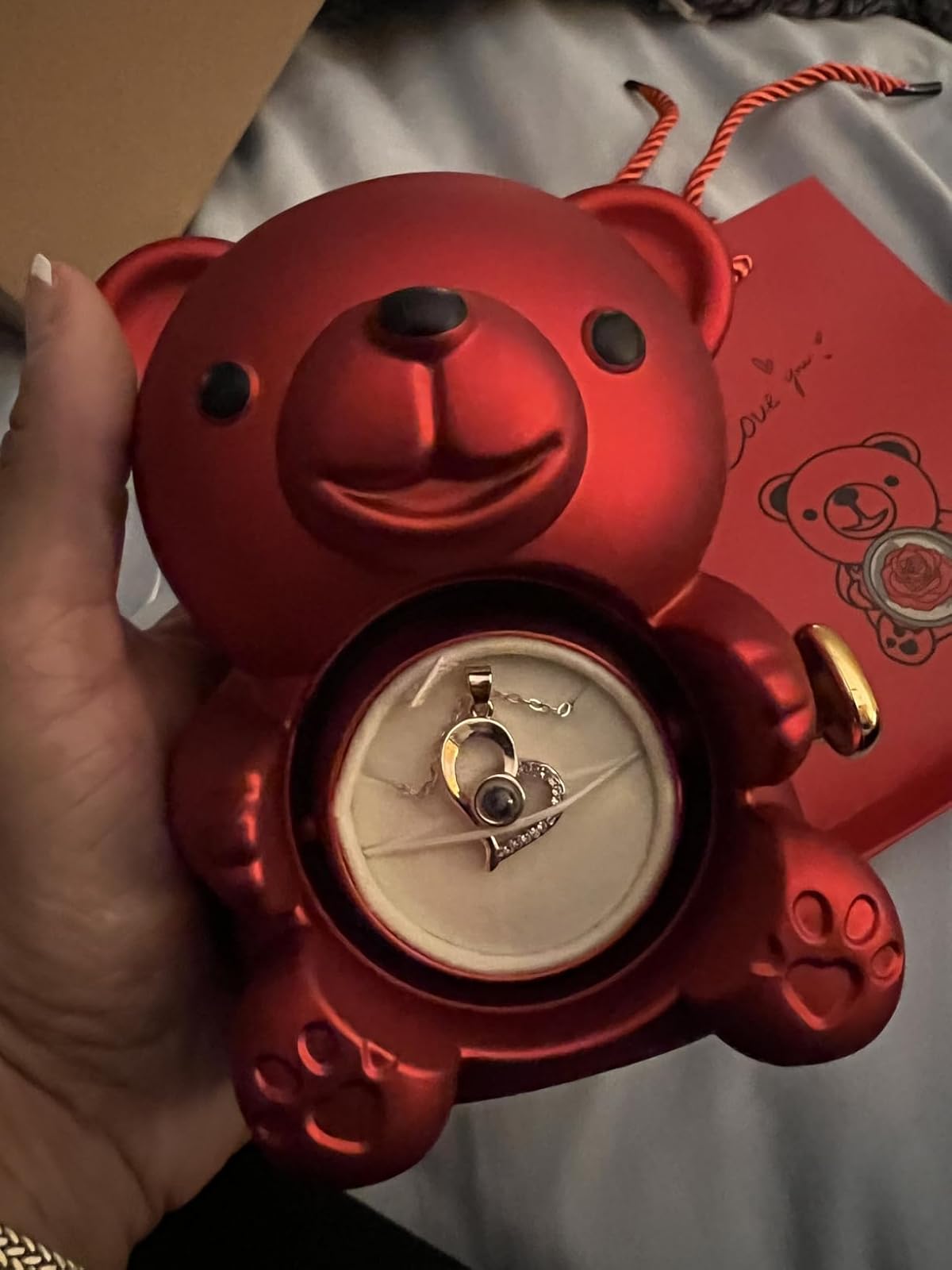 A rose teddy bear, a mini keychain, a heart necklace, and a premium gift box — ready to gift 🎁